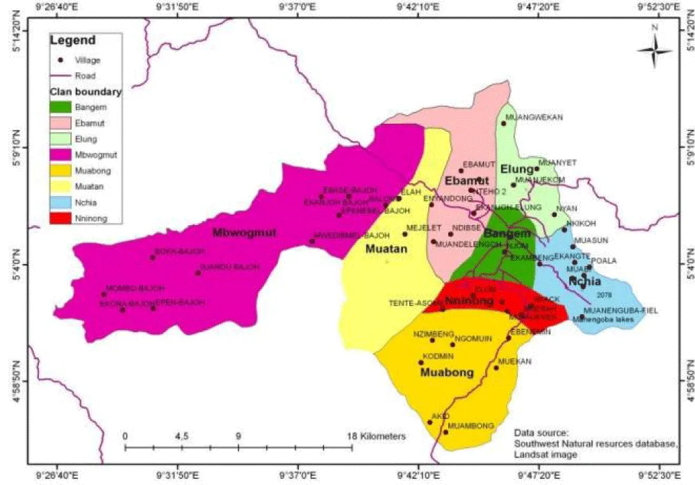 Bangem is a city located in the Southwest Region of Cameroon, situated between latitude 5°06’N and longitude 9°51’E [15]. It lies within the Kupe-Muanenguba division, nestled in the heart of the Cameroon volcanic line, a prominent geographical feature characterized by a series of mountain peaks and plateaus [16]. Bangem experiences a tropical rainforest climate, characterized by a distinct wet and dry season [17]. The wet season typically lasts from March to October, with annual rainfall averaging between 2,000 to 3,000 mm [15]. The dry season occurs from November to February, with average temperatures ranging from 22°C to 32°C throughout the year [17]. More so, the region is dominated by lush, evergreen rainforest vegetation, with a diverse array of tree species [18]. The forest is characterized by a multi-layered canopy, with emergent trees reaching heights of up to 50 meters [15]. Common tree species include Milicia excelsa, Terminalia superba, and Entandrophragma cylindricum [19]. The rainforest supports a rich and diverse wildlife community, including numerous species of primates, ungulates, carnivores, and avifauna [15]. Notable mammalian species found in the area include the drill (Mandrillus leucophaeus), the red-capped mangabey (Chlorocebus torquatus), and the forest elephant (Loxodonta cyclotis) [20]. The avifauna is particularly diverse, with over 300 bird species recorded, including the Double-spurred Francolin (Francolinus bicalcaratus) [21]. Additionally, this region is well-drained, with a network of rivers and streams flowing through the landscape [17]. The Mungo River, a major tributary of the Wouri River, is one of the primary waterways in the area, providing a vital source of freshwater for both the local communities and the diverse ecosystem [15] (Figure 1).