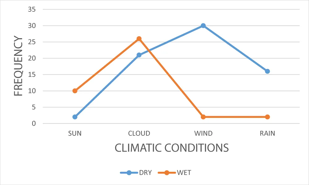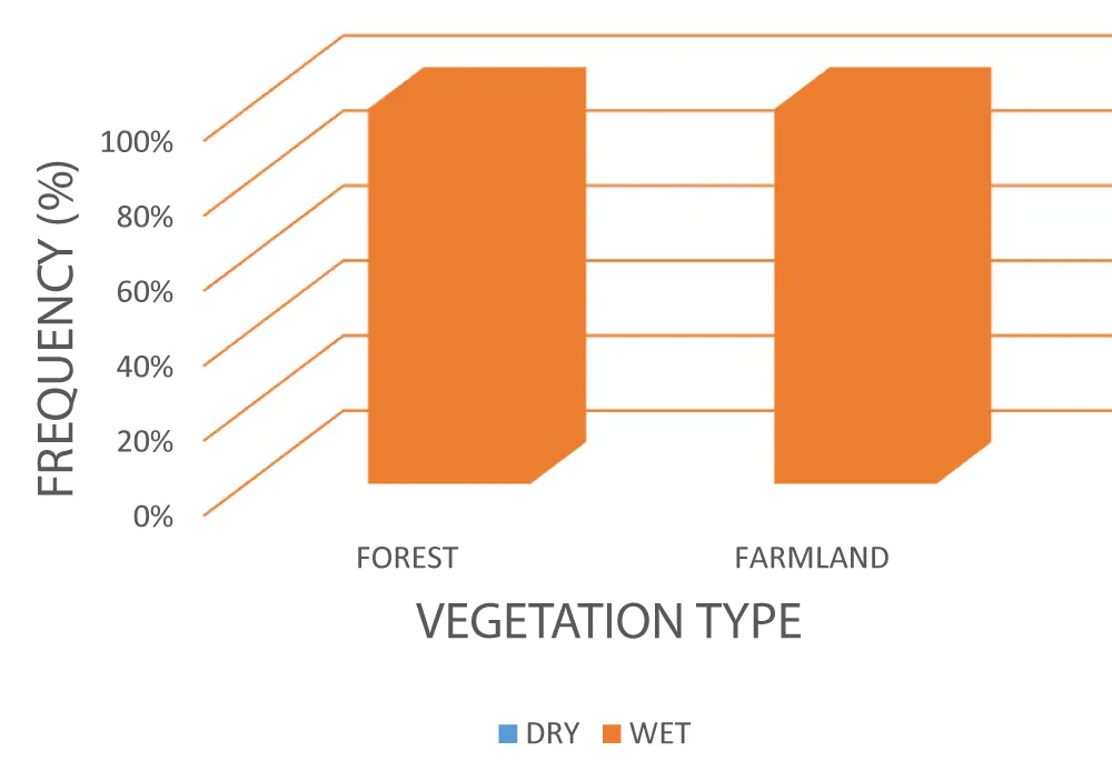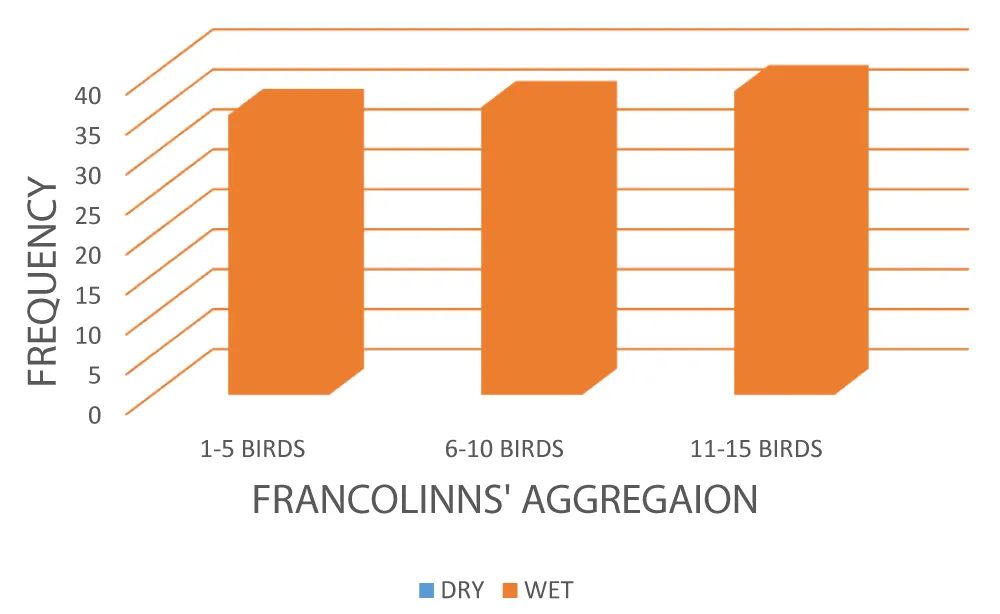 Seasonality revealed a significant association on birds’ aggregation X2 = 53.326 df = 2 P = 0.000 (Figure 2), Climatic conditions X2 = 36.093 df = 3 P = 0.000 (Figure 3), and vegetation X2 = 38.385 df1 P = 0.000 (Figure 4) respectively. Francolins are a type of ground-dwelling gamebird found in parts of Africa and Asia. Their aggregation behavior, or the way they form social groups, can be influenced by seasonal changes in their environment. During the breeding season, francolins typically become more territorial and solitary. Male francolins will establish and defend individual territories, and breeding pairs will stay together within their territory. This helps ensure access to mates and resources needed for successful breeding and nesting. As the non-breeding season approaches, francolins often begin to form larger social groups or coveys. This is thought to provide benefits such as improved predator detection and defense, as well as more efficient foraging. Francolins inhabit diverse environments across Africa and Asia, and their breeding and behavioral patterns are closely tied to the seasonal variations in local climatic conditions [7,22]. In many francolin habitats, the annual cycle is dominated by distinct wet and dry seasons, which have a profound influence on resource availability, vegetation structure, and other environmental factors that shape francolin ecology [7,23]. Francolins are ground-dwelling gamebirds that inhabit a variety of habitats, including grasslands, savannas, and shrublands. The seasonal changes in these vegetation communities play a critical role in supporting francolin populations. Precipitation patterns are a major driver of vegetation dynamics in francolin ecosystems. During the rainy season, the growth and productivity of grasses, shrubs, and other plants typically increase dramatically [24]. This seasonal flush of vegetation provides vital cover and food resources for francolins. For example, the seeds, fruits, and invertebrates associated with lush rainy season vegetation are important dietary items for many francolin species [7,22].