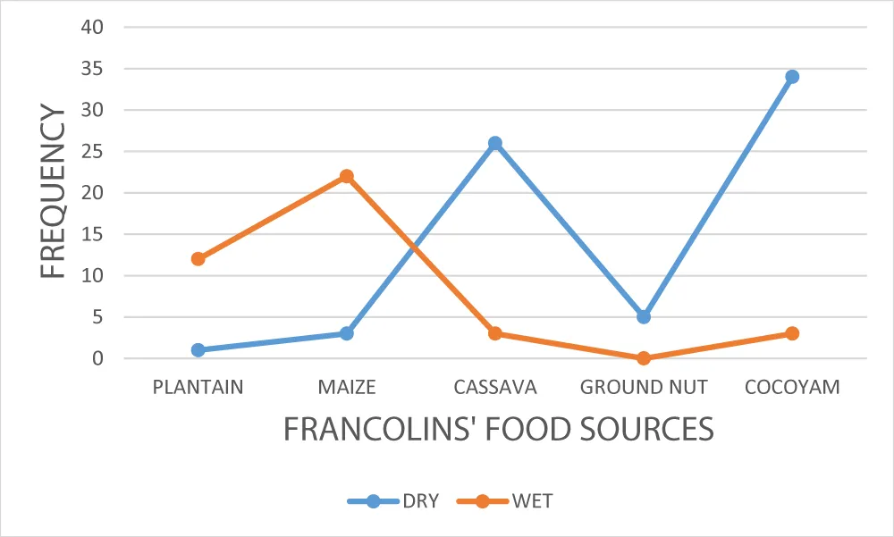 Additionally, seasonality is significantly associated with different food types consumed by the birds, X2 = 70.217, df = 4, P = 0.000 (Figure 5). Francolins are omnivorous birds that rely on a diverse array of seasonal food resources to meet their nutritional needs. The availability and abundance of key food plants like plantain, maize, cassava, groundnut, and cocoyam can have a significant impact on francolin populations. During the wet season, the lush growth of grasses, herbs, and other vegetation provides francolins with access to an abundance of seeds, fruits, and invertebrates [7,22]. This includes the starchy tubers and rhizomes of plants like cassava and cocoyam, which can be important food sources [29]. As the dry season progresses, the die-off of herbaceous vegetation can reduce the availability of these readily accessible food items. Francolins may then shift their foraging to rely more heavily on the seeds, grains, and nuts produced by woody plants like maize and groundnut [25]. The seasonal cultivation and harvesting of staple crops like plantain, maize, and cassava can also influence francolin foraging patterns [30]. After fields are cleared and planted, francolins may congregate to feed on spilled grains and invertebrates associated with the cropping system. As crops mature and are eventually harvested, francolins must seek out alternative food sources. The timing and abundance of these seasonal food resources can be critical for francolin reproduction and survival. For example, the availability of high-protein invertebrates during the breeding season is thought to be important for chick growth and development [7,22]. Climate change, however, is disrupting the normal seasonal patterns of precipitation, temperature, and vegetation growth in many francolin habitats [27]. This can lead to mismatches between the timing of francolin breeding/foraging and the peak availability of key food plants.