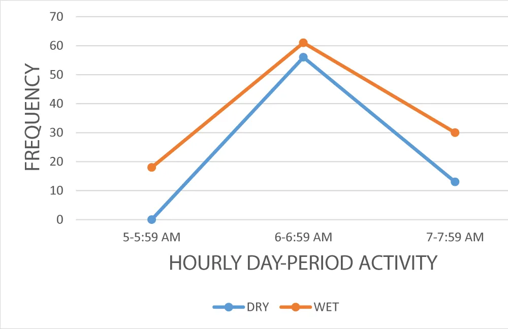 There is also a significant relation between seasonality and the various hourly periods of the day, X2 = 57.529, df = 2, P = 0.000 (Figure 6). Francolins exhibit distinct daily activity patterns that are closely linked to the seasonal changes in their environment [7,22]. During the wet season, when resources are generally more abundant, francolins tend to be active for longer periods throughout the day, utilizing a broader range of the available daylight hours [22,26]. This may include increased foraging, territorial defense, and other vital behaviors. For example, Hildebrandt’s francolin (Francolinus hildebrandti) in East Africa has been observed to be active from as early as 5 am to as late as 7 pm during the wet season, with peak activity periods in the morning and late afternoon [7,23]. In contrast, during the dry season, when resources may be more scarce, francolins often exhibit a more concentrated daily activity pattern, with longer periods of rest or inactivity during the hottest parts of the day [7,22]. This may help them conserve energy and minimize exposure to environmental stresses, such as high temperatures and reduced water availability. For instance, the red-winged francolin (Scleroptila levaillantii) in southern Africa has been documented to be most active in the early morning and late afternoon during the dry season, with a midday lull in activity [7,23]. The specific timing of francolin activity patterns can also be influenced by factors such as predation risk, competition, and human disturbance [7,22]. Francolins may adjust their daily routines to avoid peak activity periods of their predators or competitors, or to minimize encounters with human activities, such as agricultural work or ecotourism. Furthermore, the degree of seasonality in a given francolin habitat can vary depending on factors like latitude, elevation, and local climate patterns [7,27]. Francolins living in equatorial regions with less pronounced seasonal variations may exhibit a more consistent daily activity pattern throughout the year, compared to those in more temperate or arid environments with distinct wet and dry seasons. Understanding the seasonal changes in francolin day-period (hour) activity patterns is crucial for effective conservation and management strategies, as it can inform decisions on habitat protection, resource management, and mitigation of anthropogenic impacts [7,10]. Ongoing monitoring and research on these temporal activity patterns can provide valuable insights into the ecological requirements and adaptive strategies of francolins.