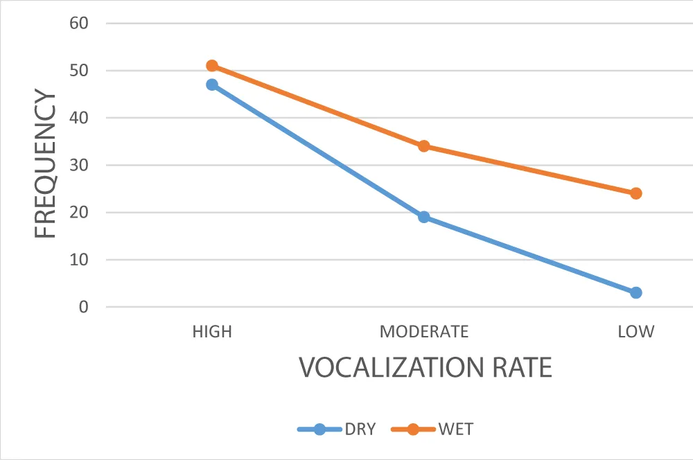 Furthermore, seasonality showed a significant link with vocalization communication of francolin birds, r = 0.647, P = 0.000 (Figure 7). During the breeding season, which typically coincides with the onset of the rainy season in many francolin habitats, males become highly vocal as they establish and defend territories [7,22]. This vocal activity serves to attract mates, signal dominance, and deter rival males. The repertoire of francolin vocalizations can be quite diverse, including loud, ringing calls, evocative whistles, and harsh alarm cries [7,22]. The specific call types and patterns used by males during the breeding season may vary between species and geographic regions. For example, the Hildebrandt’s francolin (Pternistis hildebrandti) is known to produce a distinctive, repeated “ko-ko-ko-ko” call that carries over long distances to advertise its territory [31]. The timing and frequency of this call are believed to be closely linked to the availability of resources and the female’s breeding cycle. As the dry season progresses and breeding activities wind down, the vocal activity of male francolins often decreases [7,22]. Francolins may still produce occasional contact calls or alarm vocalizations, but the intense territorial signaling is typically reduced. The behavioral and physiological mechanisms underlying these seasonal changes in vocalization are not fully understood, but are likely driven by a complex interplay of hormonal, environmental, and social factors [26,32]. Seasonal variations in food availability, predation risk, and other ecological conditions can influence the costs and benefits of vocal display, leading to strategic adjustments in vocalization patterns [33,34]. Climate change-induced disruptions to normal precipitation and vegetation cycles have the potential to desynchronize the seasonal cues that trigger and maintain francolin vocal behavior [27]. This could have cascading impacts on mate attraction, territory defense, and other key aspects of francolin reproduction and social dynamics. Conserving francolins will require understanding and managing these intricate relationships between seasonality, ecology, and vocal communication. Monitoring francolin vocalizations could provide valuable insights into population status and habitat health, informing more effective management strategies.