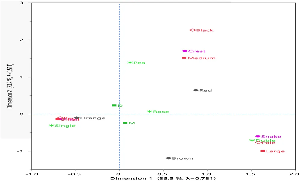 Morphological variation in local chicken ecotypes: BaBased on the identified dimensions of correspondence analysis the red eye color chickens from the Doba district were closely clustered together and had higher frequency (48.57%) while orange the orange eyes color is more closely to the Masala district and represented more frequency (82.38%) (Table 2). Brown eyes colour were equal dimensions in both ecotypes. This result is corroborated by the report of Ayana [11] who reported that the dominant eye color of the chicken ecotype was orange and red colour in the Awi zone Amhara regional state. Moreover, red eye colour is influenced by the degree of iridic vessel injection and the hemoglobin content of the blood [12]. According to Nelson [12], when chickens suffer from general anemia, a smaller amount of red coloration will be noted due to loss of blood volume. Therefore, eye colour variation depends on the pigmentation (carotenoid pigments and blood supply) of several structures within the eye [13]. Another variation might be nutritional status, a breed’s specific traits, genotype, and reflected adaptation fitness to their environment.